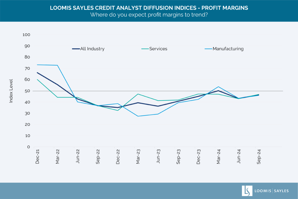 Chart source: Loomis Sayles Credit Analyst Diffusion Indices, as of 18 September 2024. For the profit margins component, readings above 50 indicate a rising trend.Ā The chart presented above is shown for illustrative purposes only.Ā Some or all of the information on this chart may be dated, and, therefore, should not be the basis to purchase or sell any securities. The information is not intended to represent any actual portfolio. Information obtained from outside sources is believed to be correct, but Loomis Sayles cannot guarantee its accuracy. This material cannot be copied, reproduced or redistributed without authorization.