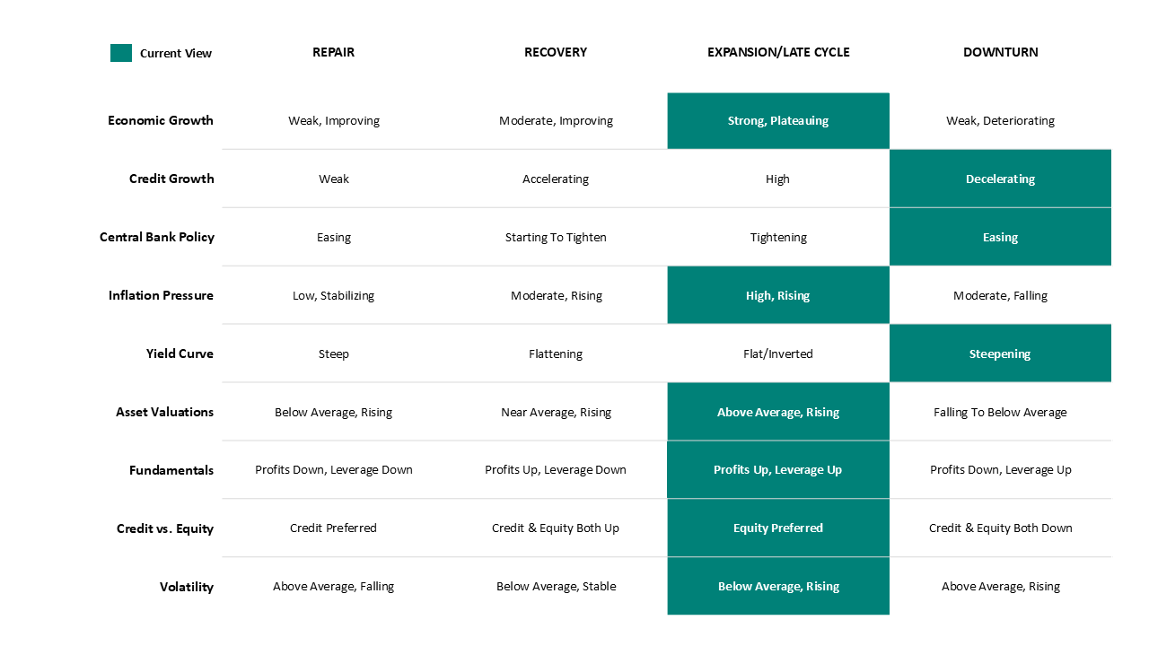In our view, credit cycle analysis requires art and science. We track key economic indicators that tend to behave differently in each phase of the cycle, and put them into context using our credit cycle framework and collective experience. Currently, these indicators primarily fall within expansion/late cycle. We believe the credit cycle remains in this phase of the cycle based largely on the strength of bottom-up fundamentals. At this stage of the cycle, investors tend to focus on capital preservation and moving up in quality.